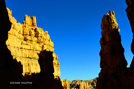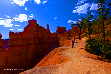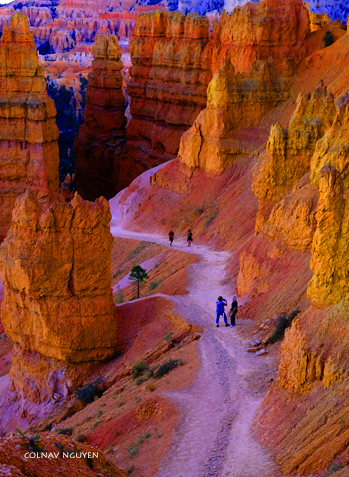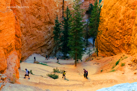 Đến nơi chỉ mới hơn 3 giờ trưa, thế là cùng tức tốc làm cuộc hiking đầu tiên ở cái trail cần phải đi nhất trong tất cả các trail ở đây, đó là Navajo Loop Trail, xuống đến đáy rồi, sắp nối qua Queen’s Garden Trail thì nghe mấy người đi ngược chiều khuyên nên quành trở lại vì còn xa lắm mà trời thì tối rất nhanh. Nghe vậy đành quay lui, được thôi, nhờ vậy mà có thể nhìn thấy cái đồ sộ của các hoodoo từ dưới chân chúng.