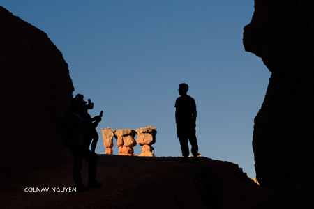 Chóp của ba hoodoo cao ngất ngưởng vươn lên ở chân trời, làm phông cảnh cho mấy cô người Hoa đang xúm nhau chụp hình một người đàn ông nào đó. Ước gì mình hân hạnh được như vậy. Đây là lúc tôi đang lên dốc ở một khúc quành, vừa nhìn thấy họ tôi lấy cớ nghỉ mệt và một công hai việc, turn on máy ảnh luôn luôn đeo trước ngực. 4:01 pm.