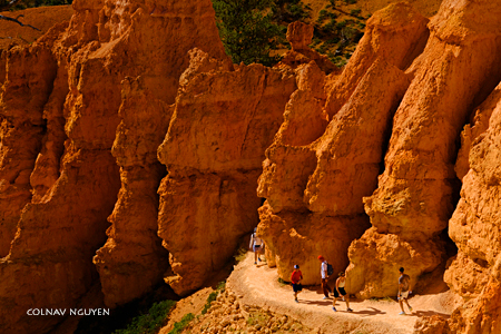 Sáng hôm sau quày trở lại, dành suốt ngày để hiking các trail chính. Đây là đoạn gần giao điểm các trail, Navajo và Queen’s Garden Trail, nhìn lui thấy kẻ ra người vào một vòng cung nhỏ, xuyên giữa những hoodoo ốm yếu xếp hình như nang cá. 2:24 pm.