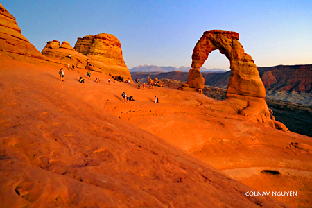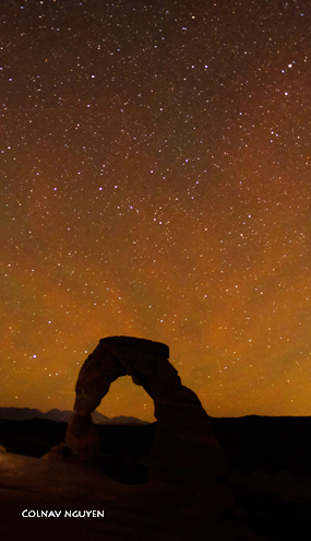 Delicate Arch dưới bầu trời đầy sao. Không ngờ chụp sao trời xong, thì đường về hoàn toàn tối thui, vậy mà tụi này vẫn mò lần xuống đến bãi đậu xe được. Dễ lắm đừng lo, cứ nối đuôi theo ánh đèn của người đi trước mà đi thì trật chỗ nào được, họ đi lên đi xuống rần rần, bất kể giờ giấc, thậm chí có cả con nít nữa.7:11 pm