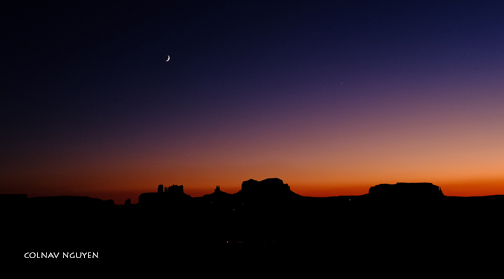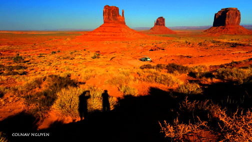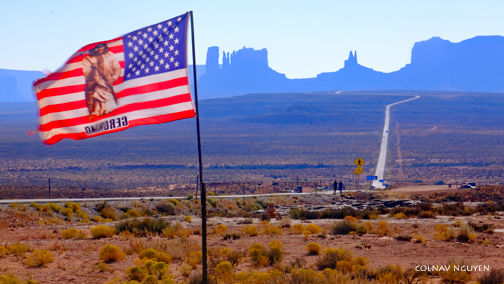 Monument Valley, biểu tượng của miền Viễn Tây Hoa Kỳ, nằm trong tiểu bang Utah nhưng trên vùng cai quản của bộ tộc người da đỏ bản địa tự xưng là Navajo Nation. Ở bên ngoài có cắm lá cờ Mỹ in chồng lên trên bằng hình vẽ của Tướng Geronimo, người hùng da đỏ chống lại sự xâm lăng của người da trắng cách đây trên 200 năm trước. Chỗ dưới dốc có tên gọi là Forrest Gump Pt, từ khi Tom Hank đến đóng một đoạn của cuốn phim mang cùng tên tại địa điểm này. 3:23 pm.