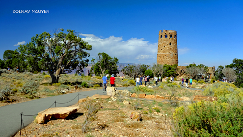 Desert View Watchtower ở Desert View Pt, một điểm thu hút du khách nhân tạo mộc mạc, xây vào năm 1932 bởi kiến trúc sư kỳ cựu Mary Cloter, người bị ảnh hưởng phong cách xây dựng của tổ tiên người bản địa Pueblo, chỉ xây bằng vật liệu đá. Địa điểm này nằm xa hẳn visitor center, không nằm trong tuyến shuttle bus phục vụ miển phí chạy trong khuôn viên. Muốn đến đây phải từ đó tự lái xe đi. 12:17 pm.