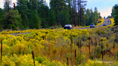Trước mặt là hướng đi về thị trấn Williams, nơi chúng tôi sẽ ngủ khách sạn qua đêm cuối cùng, dọc trên đoạn đường dài 60 dặm, tức 90 km, mùa này hoa vàng nở rộ. 3:34 pm.