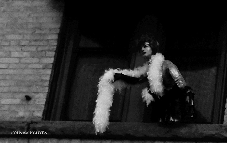 Người nộm một em phận má hồng đang ngồi đón khách trên cửa sổ quán bar tên The Red Garter.