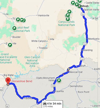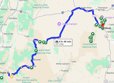 Giã từ hai cái cabin chúng tôi đã ngủ hai đêm ở Tropic, xe trực chỉ thị trấn Moab, nơi gần hai NP Canyonland và Arches, và cũng gần Monument Valley luôn. Đoạn đường theo Google dài xấp xỉ 300 dặm tức 480 km, thời gian chạy xe mất 5 tiếng. Vì muốn qua cổng Arches NP phải xin giấy phép trước, mỗi ngày họ giới hạn một số lượng nào đó xe được vào mà thôi. Tôi chọn giờ hẹn vào lúc 3 giờ trưa và giờ hẹn chỉ có hiệu lực trong vòng 1 tiếng đồng hồ nên trên đường từ Tropic, đến đây, chạy qua biết bao nhiêu cung đường tuyệt đẹp, xuyên qua cả Capitol Reef NP hùng vĩ mà không thể dừng, bỏ luôn cả Goblin State Park, trong đó tụ tập những hoodoo lùn, chỉ cao hơn đầu người. Nhìn lại trên bảng đồ biết bao lá cờ tôi cắm sẵn để nhớ chỗ nào sẽ dừng xem, cuối cùng tính cho nhiều kết quả chẳng được bao nhiêu.
