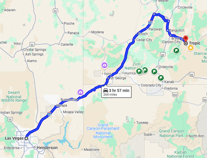 Sáng hôm sau 3 tháng 10, bấm thang máy xuống lobby ở tầng trệt ăn sáng, trả phòng rồi lên đường trực chỉ Bryce Canyon National Park ở Tiểu Bang Utah, đoạn đường dài hơn 260 dặm tức gần 420 km, thời gian bác Google tính toán là 4 giờ lái xe.