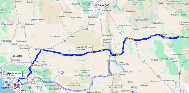 Hôm sau dong ruổi chặng cuối của cuộc hành trình, lần này lâu bảy tiếng đồng hồ trên đoạn đường dài 436 dặm, tức xấp xỉ 700 km. Từ Williams, theo Route 40 đi về hướng Tây mãi đến khi gặp lại Fwy15 ở Barstow thì nhập vào đi về hướng nam, tức hướng về biển TBD, để về đến “home sweet home!”