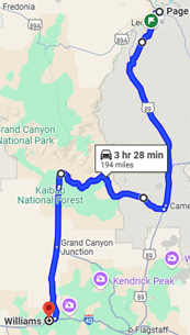 Rời HorseShoe Bend State Park ở Page, Arizona, chúng tôi lấy Route 89 xuôi nam đến khi gặp Route 64 thì rẽ phải vào để chạy đến Grand Canyon NP, mép cực đông của công viên, nơi không có xe buýt shuttle bus phục vụ mà muốn khám phá phải tự lái xe đi. Viếng hết các điểm quan trọng thì thẳng về Williams, thị trấn cổ nằm trên Route 66, con đường cái quan lịch sử của Mỹ quốc.