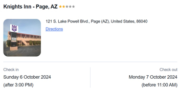 Ngủ qua đêm với 2 phòng tại Knights Inn, tức “quán trọ của các hiệp sĩ thời trung cổ” ở thị trấn Page, để hôm sau đi viếng HorseShoe Bend State Park.