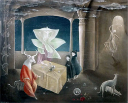 Leonora Carrington was born in 1917 in Clayton Green, England, into a wealthy Roman Catholic family. She had a rebellious nature and was expelled from two convent schools. After being expelled, she was sent to boarding school in Florence when she was 14 years old. She later studied art at Amédée Ozenfant’s academy in London. When she was 19, Carrington visited the first International Surrealist Exhibition in London and was especially interested in the work Two Children Are Threatened by a Nightingale by Max Ernst, whom she met in 1937. They began a relationship and Carrington moved to Paris in order to live with him. She met André Breton and Salvador Dalí when there and participated in the Exposition Internationale du Surréalisme in 1938. During that time, she made some of her first Surrealist pieces, like her famous work Self-Portrait (Inn of the Dawn Horse).