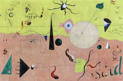 His painting The Hunter (Catalan Landscape) is one example of Miró’s combination of figurative and abstract elements. It includes references to his family’s farm in Spain and shows a hunter with a rabbit he killed. According to Miró, his work process was characterized by a first stage which he called free and unconscious, and a second stage, which he described as carefully calculated.