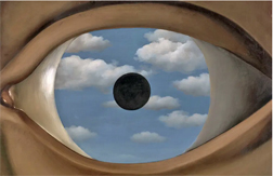 Often associated with his use of the bowler hat, clouds, and green apples, Magritte is known for depictions that turn the ordinary and familiar into something strange and uncanny. The False Mirror from 1929 depicts an eye with clouds instead of an iris. Magritte wasn’t the only Surrealist who was captivated by eyes. Their interest stemmed from the eye’s role as a bridge between the internal subjective self and the outer reality.