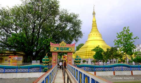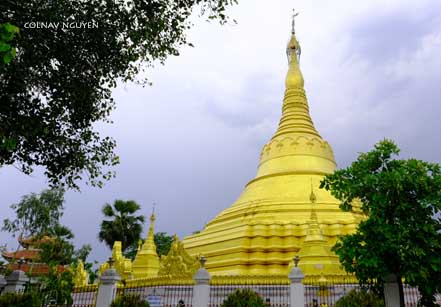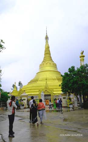 Viếng tượng Phật niết bàn xong vừa bước ra khỏi tòa nhà thì bầu trời trước mặt bỗng đen xám đen xịt, gió xoáy vòng về phía tôi, mạnh dần, cuốn tung lá, cành nhỏ, bất cứ thứ gì. Tôi lấy khẩu trang luôn có sẵn trong túi để che bụi đang cuộn lên mù mịt. Thoát ra khỏi khuôn viên Đền Phật Niết Bàn bằng cửa sau, băng qua một con đường thì thấy hiển hiện một đại bảo tháp vàng với chóp nhọn cao vút, kiến trúc tiêu biểu của Miến Điện.