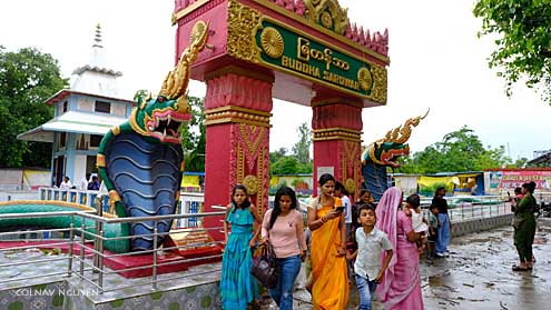 Khách tập trung trước cổng có hàng chữ Buddha Sarovar, theo đó “sarovar” tiếng Hindi có nghĩa là hồ, hai bên có hai rắn thần giữ cửa.