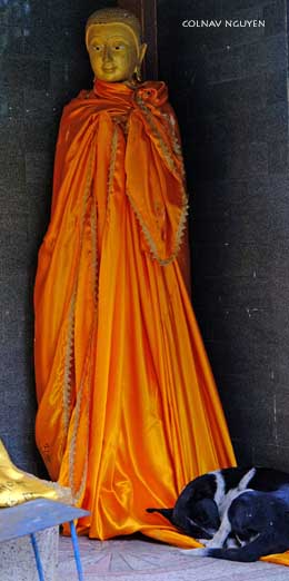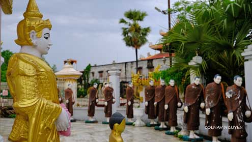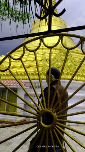 Tôi và nhiều người đang lóng ngóng bên ngoài khuôn viên chùa, trù trừ tính cởi giày bước vào thì trời đổ mưa, và mưa lớn ào xuống rất nhanh. Tôi dọt nhanh vào bên hông chùa, nơi ít phút trước đây thấy mấy đứa thanh niên rượt đùa nhau vào phía trong. Tiến sâu vào kiếm chỗ núp mưa, thấy có khu nhà hai tầng chắc dành cho chư tăng ở, nhưng ngay trước mặt thấy có một dãy mái tôn một tầng áp sát với tòa nhà cao, chắc là nhà kho. Tôi chui vào đó ngồi trú mưa. Mưa to và kéo dài khá lâu, chỉ biết kéo phone ra lướt sóng giết thì giờ. Cuối cùng thì mưa cũng phải ngớt, nhẹ hạt hẳn đi, người người bắt đầu từ chỗ núp của họ túa ra. Tôi theo người ta đi vào đền Miến Điện.
