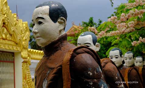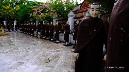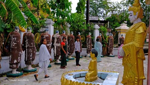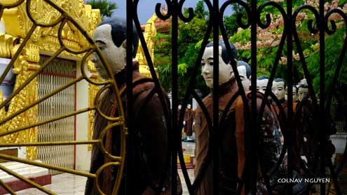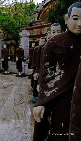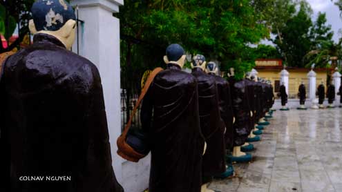 Bên ngoài hàng rào nhìn vào, tượng một đoàn các vị sư nối đuôi nhau lặng lẽ đi vòng quanh.