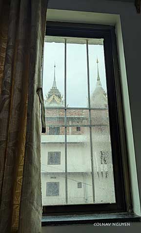 Sáng 25/5, ngồi trước một bàn thấp cạnh cửa sổ ăn điểm tâm, uống cà phê, khách sạn phục vụ tận phòng. Bên ngoài vẫn còn mưa nặng hạt. Hai chóp tháp vươn cao bên kia là chùa Thái Lan đang xây dở dang. 8:24 am
