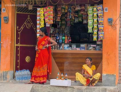 Quán bán đồ tạp hóa ở vùng ngoại ô với hai phụ nữ mặc áo dài truyền thống, một hình ảnh rất Ấn Độ.