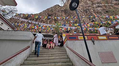 Lên hết tầng dốc cuối cùng bằng bậc cấp này xong là đến nơi. Tại đây ngoài hang đá còn có đền thờ Phật.