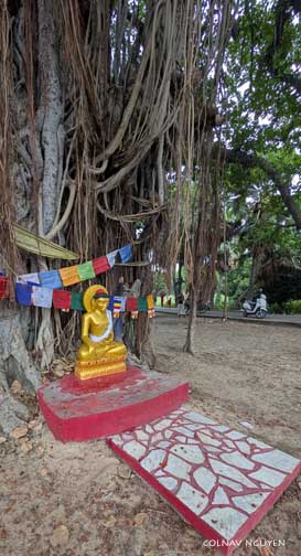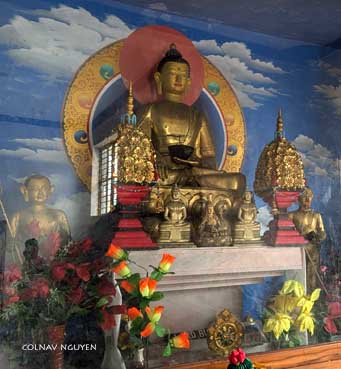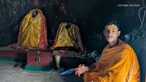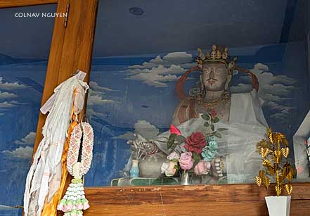 Bên phải có hai tượng nhỏ được phủ kín chỉ chừa đầu, không rõ là tượng của ai. Người tu sĩ sau khi đọc câu kinh, lấy ngón tay quẹt vệt màu lên giữa hai lông mày tôi lấy phước báu và xin tiền cúng dường.