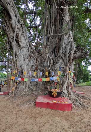 Giã từ núi Khổ Hạnh Lâm chạy xe xuống đến gần sông Ni Liên Thiền thì thấy bên phải có một cây cổ thụ lớn, một số người đang tụ tập để quây phim chụp hình. Nhận ra ngay họ là người Việt tôi liền yêu cầu anh hướng dẫn viên người Ấn dừng lại. Từ ngày qua Ấn, hôm nay là lần thứ hai tôi được gặp đồng hương. Hôm kia thấy ba người ở vườn Lộc Uyển nhưng không tiếp xúc vì thấy họ đang bận.
