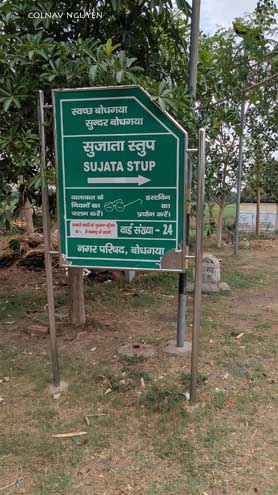 Bảng chỉ lối vào bảo tháp Sujata Stupa. Sujata là cô thôn nữ đã dâng cho Đức Phật bát cháo sữa khiến Ngài hồi sinh sau sáu năm tu ép xác khổ hạnh.