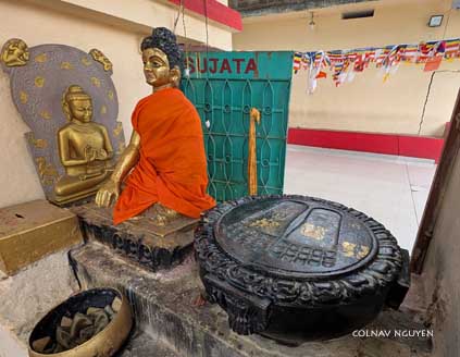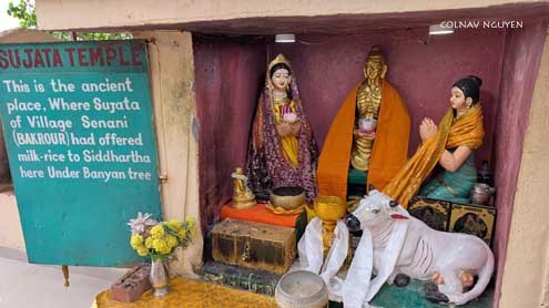 Đền Sujata khiêm tốn với tấm bảng ghi rằng nơi đây vào thuở xa xưa nàng Sujata người làng Senani, đã từng dâng lên cho Sĩ Đạt Đa bát cháo sữa ngay tại chân cây Bồ Đề này.