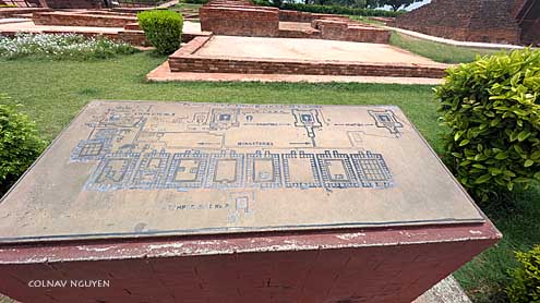 Quần thể khu Nalanda chiếm diện tích 14 héc-ta (488×244 mét). Các công trình xưa đều xây bằng gạch đỏ, nay đã đổ nát chỉ còn phế tích. Nhưng trước thế kỷ 13 vào thời hoàng kim thì Nalanda là nơi thu hút hằng nghìn sĩ tử xa gần tận Tây Tạng, Trung Hoa, Hy Lạp, và cả Ba Tư đến tu học.