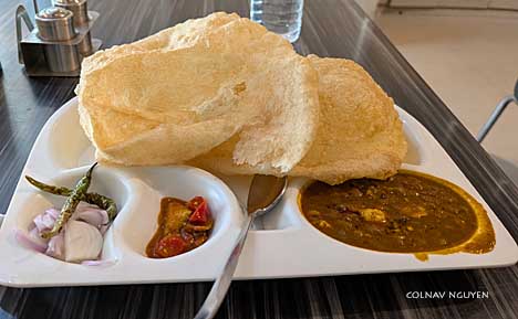 Theo Google, Chhole Bhature là một món ăn phổ biến và đậm đà hương vị có nguồn gốc từ Bắc Ấn Độ, đặc biệt gắn liền với vùng Punjab. Đây là sự kết hợp giữa cà ri đậu gà cay (chhole) ăn kèm với bánh mì chiên giòn (bhature). Bữa ăn thịnh soạn này là lựa chọn phổ biến cho bữa sáng, bữa xế hoặc bữa trưa trên khắp Ấn Độ và nhiều nơi khác.