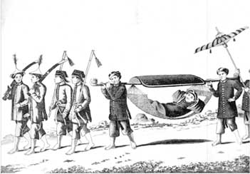 Năm 1876, Dutreuils de Rhins, trưởng một trong năm chiếc tàu chạy bằng hơi nước mà Pháp tặng cho triều đình Huế, làm một chuyến du hành bằng đường bộ từ Đà Nẵng ra Huế theo sự triệu vời của một thượng thư An Nam. Ông ta được cung cấp võng cùng phu gánh hành lý để đi đường. Câu chuyện của ông này kể lại về chuyến đi thật khá lý thú. Năm giờ sáng ngày 7 tháng Mười, tàu của Dutreuils cập vào làng Thanh Bình để chuẩn bị khởi hành. Đoàn tùy tùng mỗi người được cấp bốn phu gánh võng, ngoài ra cả đoàn có thêm mười phu gánh thức ăn, cộng thêm người làm thông ngôn nâng tổng số cả đoàn lên đến 65 hoặc 70 người. Trong đoàn có một tay thợ máy ví quá mập nên thật khó mà nằm vừa một chiếc võng nào. Họ nghỉ chân ở làng Nam Ô nơi có một bót lính Tây biệt phái từ đồn Tourane rồi sau đó tiếp tục lên đường bằng cách xuống phà để qua sông Cu Đê. Họ đi bộ đến 11 giờ rưỡi trưa thì tạm nghỉ ở một chòi lá ọp ẹp bên đường vì nắng quá gay gắt. Gia chủ mời khách nghỉ trưa trên chiếc giường tre và gối kê cũng bằng tre luôn.