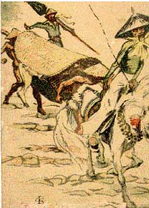 Crawfurd thuật như sau: “Gần chỗ chúng tôi vừa băng qua, trên đỉnh núi cao và trong khoảng thâm sâu của khu rừng, có một cây cột bên trên gắn một tấm bảng gỗ có hình một khuôn mặt trông thật ghê rợn, bên dưới có ghi một hàng chữ. Theo người đồng hành bản xứ thì những chữ đó là câu thần chú mà câu này phối hợp với bức vẽ có tác dụng xua đuổi ác ma thường quấy nhiễu nơi vùng này. Y còn cho chúng tôi biết rằng nếu đi đông hoặc khi trời tốt thì không phải sợ nếu đi lẻ tẻ, đặc biệt là phụ nữ thì dễ gặp tà ma. Chúng lộng nhất những khi tối trời hoặc khi mưa to gió lớn.”