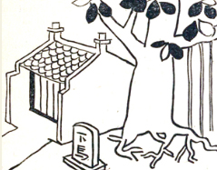 Tới miếu, ông đồ dừng lại ngắm nghía cây đa cỗi, cành lá rườm rà che gần kín cái mái rêu phong. Hai bên cửa miếu, hai pho tượng đắp bằng đất, mặt đỏ, mắt trợn tròn như nhìn chòng chọc khách qua đường, và tay cầm thanh gươm giơ lên như lăm le muốn chém ai. Bên đường một cái mốc đá với hai chữ « HẠ-MÃ » nét khắc đã mờ.