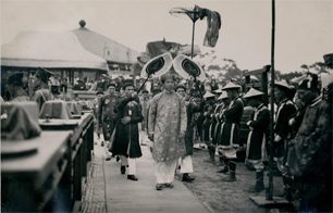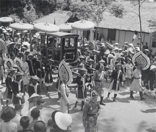 Đúng 2 giờ 40 phút thì Ngự giá tự Trai cung ra Giao Đàn. Do cửa bên hữu vào, xuống xe, tiến đến nhà Đại thử. Tôi đứng đệ nhị đàn trông rõ lắm. Hoàng Thượng đội mũ miện, mặc áo cồn, tay cầm ngọc trấn khuê (tức là cái hốt bằng ngọc), có hai ông quan võ cầm quạt lông che, bốn ông cầm đèn lồng, cầm nến, rồi mấy ông đi theo sau nữa. Ngài ngự vào nhà đại thử làm lễ quán tẩy (rửa tay).