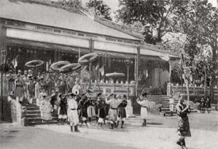 Quan Toàn quyền, quan phó Toàn quyền, quan Nguyên súy đều ở Hà Nội về xem. Nhân các ngài tới Kinh, hội Đô thành Hiếu cổ xã có đặt hai cuộc chơi rất nhã: một là cuộc trần thiết những đồ dùng đồ bầy cũ của An Nam ta để khôi phục lại hình ảnh một cái nhà cổ ngày xưa; hai là cuộc diễn tuồng Tây để quyên tiền cho hội Hồng thập tự. Trần Thiết thì ở nhà Tân thư viện, tức là điện Long An cũ. Đồ cũ, nhà cũ thực là hợp cảnh. Điện này cũng là một cái châu báu trong nghề kiến trúc của ta. Rộng rãi thênh thang, trông rất là có bề thế. Không có những lối tô điểm rườm rà, những sắc xanh đỏ sặc sỡ, mầu gỗ xưa, thềm đá cổ, mà có cái vẻ thuần túy rất đáng yêu. Cứ so sánh cái điệu cổ ấy với hai nhà Quốc Tử Giám mới đương xây ngay trước mặt, thì đủ biết nghề kiến chúc ở nước ta ngày nay có thoái bộ mà không có tiến bộ. Những nhà cửa mới dựng bây giờ không ra kiểu tây, không ra kiểu ta, lại thêm cái lối vẽ vời phiền phức, rất là khó coi. Có lắm cái cửa đền cửa phủ tưởng như xây toàn bằng mảnh bát vỡ. Thực là một cảnh tượng dễ làm cho chạnh lòng nhà hiếu cổ.