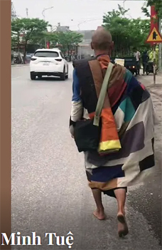Tối thầy ngủ ở nghĩa địa hoặc những căn nhà bỏ hoang. Cái áo của thầy đủ dầy để không bị lạnh. Thầy có pháp danh là Minh Tuệ, trước đây là một cán bộ địa chính, vì một lẽ duyên nào đó thầy xuất gia năm 36 tuổi bây giờ thầy 42 tuổi. Thầy phát nguyện đi bộ không dùng tiền để hiểu đời, hiểu mình, để cho mình trần trụi trước sân si, thực hành thoát khổ, muốn ra khỏi luân hồi.