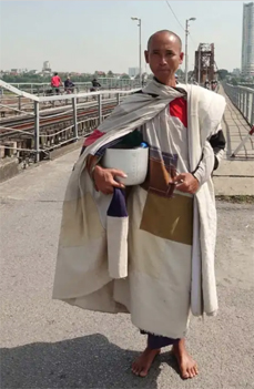 Hành trang của thầy là cái miệng luôn cười, là đôi chân trần mòn sạm, thầy có một cái bình bát chế từ lõi nồi cơm điện, kim chỉ và mấy miếng vải bố nhặt được để khi nghỉ đắp thêm vào y phục, mỗi ngày một bữa cơm chay của người dân biếu tặng, thầy không nhận tiền và cũng không lấy nhiều hơn một suất ăn.
