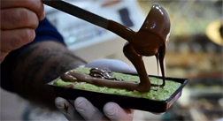 « Chúng tôi dùng quả hạnh nhân đem nướng cho thật chín để tạo thêm hương thơm. Cách chế biến này giống như cách làm kẹo praliné. Mùi vị thơm như nhau, khác hay chăng là hạnh nhân chuyển sang màu nâu nhạt, chứ không có màu xanh lục như hạt pistachio. Để cho nhân chocolat thêm giòn, chúng tôi nghiền nát những miếng bánh quy rồi trộn thêm vào hạnh nhân xay nhuyễn. Loại bánh quy giòn ở đây là loại Croquants de Cordes, nguyên là một đặc sản của vùng sông Tarn, mà thủ phủ là thành phố cổ kính Albi. Ở đây, chúng tôi bán nhiều loại chocolat mùi hạnh nhân, mỗi thanh 200 gram, nhưng giá vẫn mềm hơn so với sô cô la Dubai ».